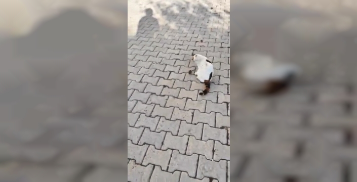 Kedi, yakaladığı fareyi bırakarak bir süre onunla oynadıktan sonra ağzıyla yakalayarak uzaklaştı.