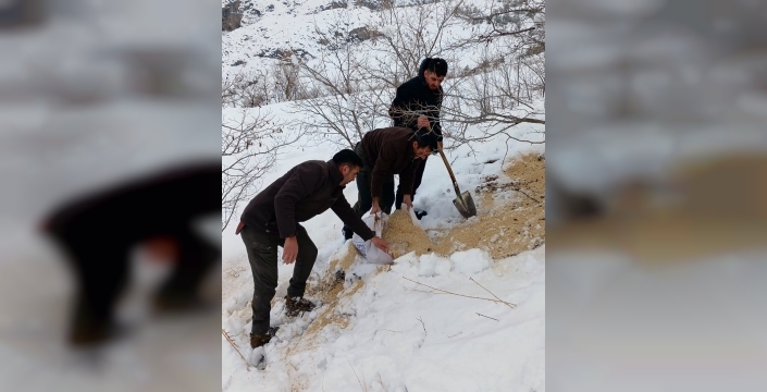 Erzincan’ın Kemah ilçesinde, ağır kış şartları nedeniyle yiyecek bulmakta zorlanan yaban hayvanları için doğaya yem bırakıldı.