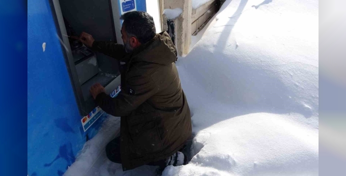 Kar yığınlarıyla çevrilen para çekme noktalarında işlem yapmak isteyen vatandaşlar, ATM’lerin önünde ayakta duracak alan bulamayınca karın üzerine oturarak para çekmek zorunda kalıyor.