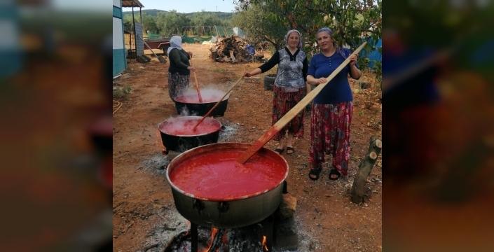 Üzümlü’nün çalışkan kadınları, devam eden kış hazırlıkları için salçaları özenle hazırlarken hem ailecek doğal ürün tüketmiş, hem de ev ekonomisine katkı sunmuş oluyor. Kadınlara erkekler de yardım etmesi dikkatlerden kaçmadı.