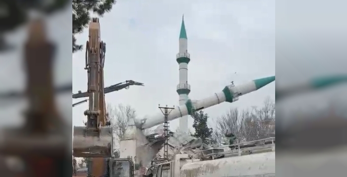Malatya’nın Yeşilyurt ilçesi Çavuşoğlu Mahallesi’nde bulunan ve 6 Şubat 2023 depremlerinde hasar alan Sanayi Cami bugün alınan çevre güvenliği önlemleri sonrası kontrollü olarak yıkıldı. İlk olarak minareleri yıkılan cami, ardından tamamen yıkıldı.
