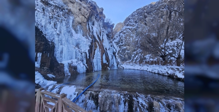 Donan şelaleyi görmek isteyen çok sayıda vatandaş bölgeyi ziyaret ederek kısmen buz tutan şelalenin ortaya çıkardığı görsel şöleni hayranlıkla izledi.