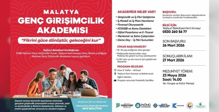 Yeşilyurt Belediyesi öncülüğünde; TOBB Malatya Genç Girişimciler Kurulu ve Yeşilyurt Kent Konseyi Genç Meclisi iş birliğiyle hayata geçirilen Malatya Genç Girişimcilik Akademisi, gençleri girişimcilik ekosistemiyle buluşturmak amacıyla 28 Mart’ta başlıyor.