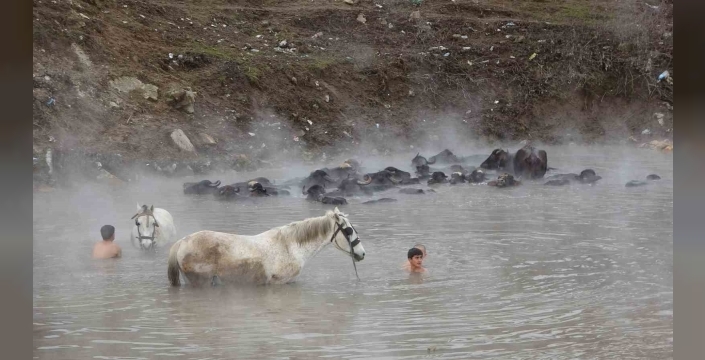 Bölgedeki besiciler tarafından kaplıca alanına getirilen manda ve atlar, şifalı olduğu bilinen termal sularda temizleniyor. Soğuk havaya rağmen sıcak suyun içinde sakin bir şekilde bekleyen hayvanlar, buharın da etkisiyle etkileyici görüntüler oluşturuyor.