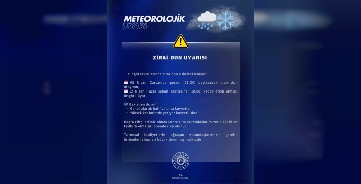Meteoroloji 13. Bölge Müdürlüğü’nden yapılan açıklamada, "Bingöl çevrelerinde zirai don riski bekleniyor. 08 Nisan Çarşamba gecesi (21.00) başlayacak olan don olayının, 12 Nisan Pazar sabah saatlerine (10.00) kadar etkili olması öngörülüyor. Başta çiftçilerimiz olmak üzere tüm vatandaşlarımızın dikkatli ve tedbirli olmaları önemle rica olunur. Tarımsal faaliyetlerle uğraşan vatandaşlarımızın önlemleri almaları büyük önem taşımaktadır" denildi.