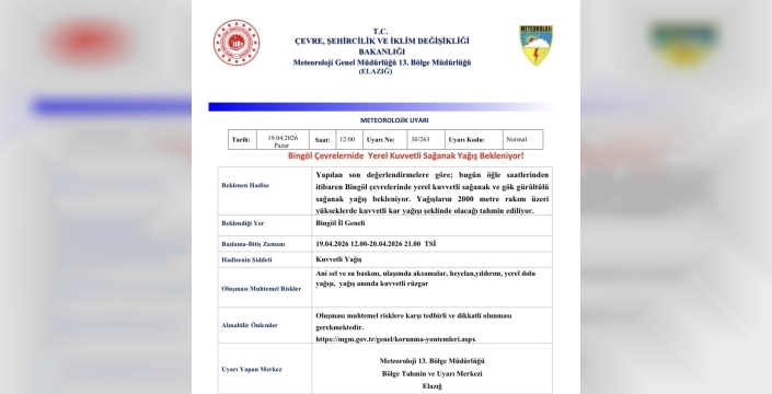 Meteoroloji 13. Bölge Müdürlüğü tarafından yapılan açıklamada, "Yapılan son değerlendirmelere göre; bugün öğle saatlerinden itibaren Bingöl çevrelerinde yerel kuvvetli sağanak ve gök gürültülü sağanak yağış bekleniyor. Yağışların 2000 metre rakım üzeri yükseklerde kuvvetli kar yağışı şeklinde olacağı tahmin ediliyor. Oluşması muhtemel risklere karşı tedbirli ve dikkatli olunması gerekmektedir" denildi.
