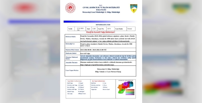 SERHED HABER - Meteoroloji 13. Bölge Müdürlüğünden yapılan açıklamada, "Elazığ’da çarşamba günü beklenen yağışların güney ilçeler ( Baskil, Sivrice, Maden, Alacakaya, Arıcak) ile 1500 metre üzeri yerlerde kuvvetli (10-20cm) karla karışık yağmur ve kar yağışı şeklinde görülmesi beklenmektedir.