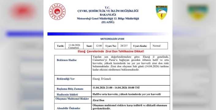 Meteoroloji 13. Bölge Müdürlüğü’nden yapılan açıklamada, "Yapılan son değerlendirmelere göre; Elazığ il genelinde, cumartesiyi pazara bağlayan geceden itibaren hafif ve orta kuvvette, yüksek kesimlerde ise yer yer kuvvetli zirai don riski bulunmaktadır. Zirai don olayının Salı günü (14.04.2026) tarihine kadar etkisini sürdürmesi beklenmektedir" denildi.