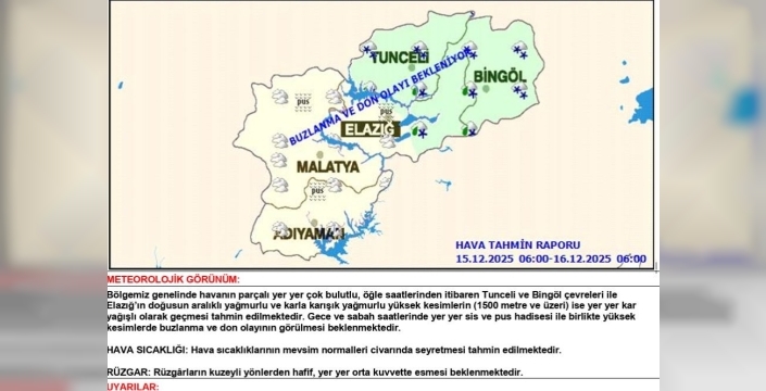 SERHED HABER - Meteoroloji 13. Bölge Müdürlüğü’nden yapılan uyarıda, "Bölgemiz genelinde havanın parçalı yer yer çok bulutlu, öğle saatlerinden itibaren Tunceli ve Bingöl çevreleri ile Elazığ’ın doğusun aralıklı yağmurlu ve karla karışık yağmurlu yüksek kesimlerin (1500 metre ve üzeri) ise yer yer kar yağışlı olarak geçmesi tahmin edilmektedir.