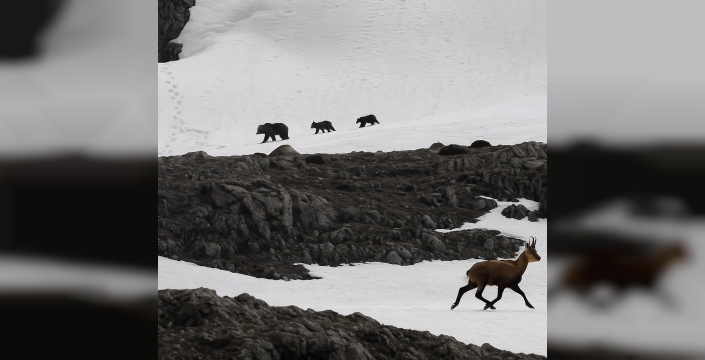 Doğal yaşam zenginliğiyle dikkat çeken Munzur Dağı’nda, boz ayı, kurt, tilki, domuz, kaya kartalı ve dağ keçisi gibi birçok yaban hayvanı aynı ekosistemde yaşıyor. Görüntülerde, boz ayının kokusunu alan çengel boynuzlu dağ keçilerinin paniğe kapılarak hızla uzaklaştığı anlar yer aldı.