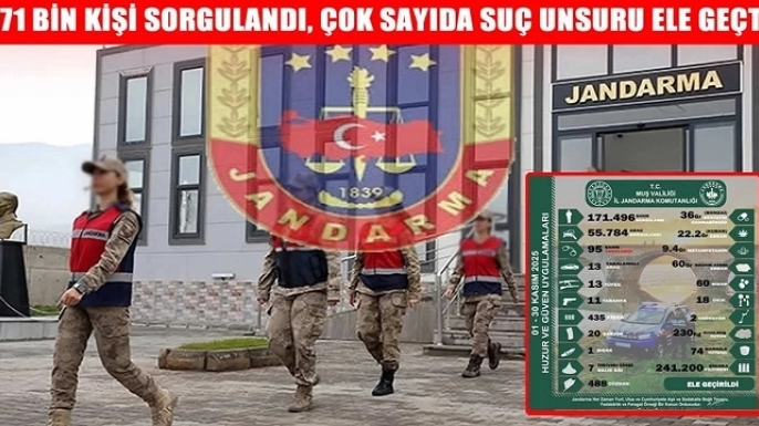 Muş İl Jandarma Komutanlığı, Kasım ayında kent genelinde yürüttüğü güvenlik ve asayiş faaliyetlerinin sonuçlarını paylaştı. Açıklamada, belirlenen noktalarda gerçekleştirilen uygulamalarda 171.496 kişinin sorgulandığı; yol uygulamaları ve mobil denetimlerde ise 55.784 aracın kontrol edildiği bildirildi. Denetimler sırasında çeşitli suçlardan aranan 95 şahsın yakalanarak adli mercilere teslim edildiği; ayrıca haklarında işlem yapılan araçlar arasında, farklı suçlardan yakalamalı 13 aracın tespit edilerek gerekli prosedürlerin başlatıldığı belirtildi.