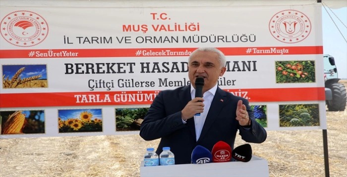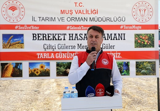 "Bütün tarlalarda biçerdöverler var. Her tarafta hasat bayramı var. Bu yıl hububattan beklentimiz 7 milyar lira. Muş'ta 1 milyon 250 bin küçükbaş hayvanımız var. Dolayısıyla Muşlu kardeşlerim ne kadar bereketli ve önü açık bir coğrafyada olduklarını anlasınlar. Tüm arkadaşlarımızla, yapay zeka, dron ile ilaçlama ve toprağın en güzel şekilde işlenmesi konusunda çalışmaya devam edeceğiz. Gelecekte Muş Ovası daha kıymetli olacak. Tarım ve hayvancılık ilimizin geleceği. Muş, her ürünün en kaliteli üretim merkezi. Çiftçi kardeşlerimizle ilimizde tarımın her yıl üzerine koyarak gelişmesine hep beraber şahitlik edeceğiz. Hasadımız bereketli olsun."
