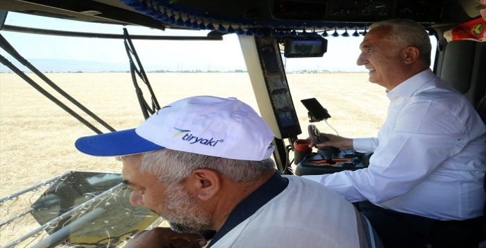 Konuşmaların ardından Vali Çakır, direksiyonuna geçtiği biçerdöverle buğday hasadı yaptı.
