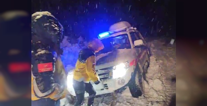 İhbar üzerine bölgeye sevk edilen sağlık ekipleri, köye ulaşmak için yola çıktı. Ancak kar yağışı nedeniyle kapanan yolda ambulans kayarak kara saplandı. Sağlık ekiplerinin tüm çabalarına rağmen bulunduğu yerden çıkarılamayan ambulans için bu kez İl Özel İdaresi ekiplerinden destek istendi. Olay yerine sevk edilen ekiplerin çalışmasıyla ambulans bulunduğu yerden kurtarıldı.