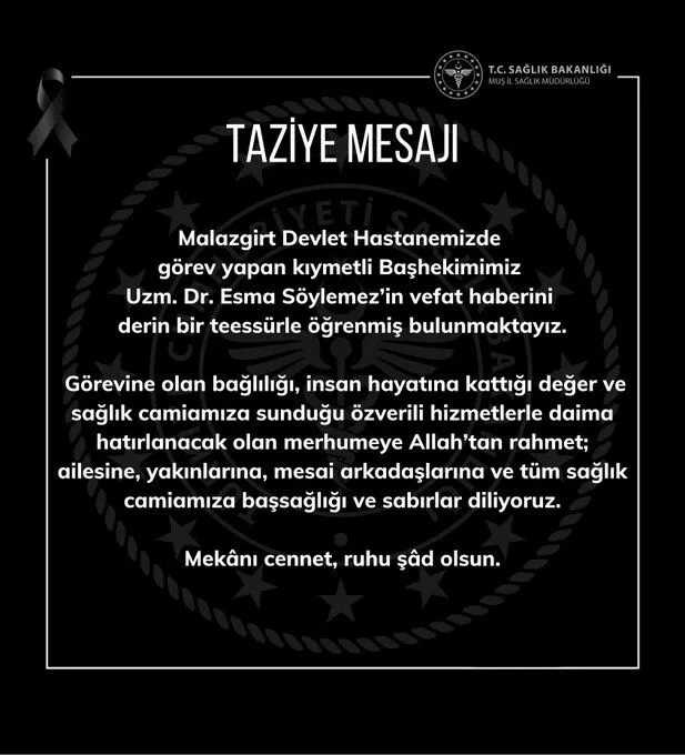 Uzman Dr. Esma Söylemez, uzun zamandır kanser tedavisi görüyordu. Son bir ay içerisinde Malazgirt Devlet Hastanesi’nde entübe olarak tedavi altına alınan Söylemez’in tüm müdahalelere rağmen sağlık durumunda olumlu bir gelişme görülememesi üzerine, deneyimli hekim hayata veda etti. Söylemez’in hem meslek hayatı boyunca gösterdiği özveri hem de hastalarına ve yakınlarına sağladığı destek, vefat haberini alan herkesin üzerinde derin bir etki bıraktı.
