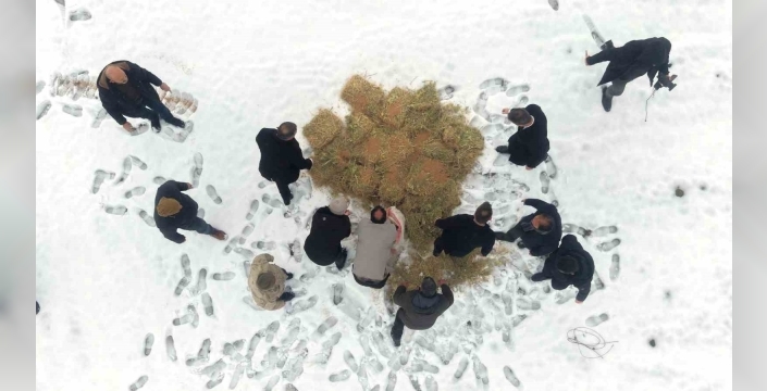 Muş’un Korkut ilçesinde yoğun kar yağışı nedeniyle yiyecek bulmakta zorlanan yaban hayvanları için dağlık alanlara buğday ve ot bırakıldı.