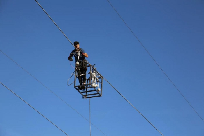 SERHED HABER - Şehirlerarası elektrik akımını sağlayan yüksek gerilim hattında örümcek adamı andıran görüntüleri ile dikkat çeken 15 işçi, sabahın ilk ışıklarıyla işbaşı yapıyorlar. Sepetlerin içinde dengede durarak çalışmalarını sürdüren işçiler, her gün birçok riski göze alarak geçimlerini sağlamaya çalışıyor. Zorlu şartlara rağmen işlerini özveriyle sürdüren işçiler, yüksek gerilim hattının güvenli bir şekilde hizmet vermesi için büyük çaba gösteriyor. İşe başlamadan önce gerekli güvenlik önlemlerini alan işçiler, metrelerce yükseklikteki tel ve direklere kanca ile bağladıkları sepetin içinde riskleri göze alarak yüksek gerilim hattında onarım ve bakım çalışmalarını sürdürüyor.