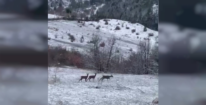 Kızıl geyikler, Erzincan’ın Refahiye ilçesinde nadir anlara sahne oldu. Kar yağışı altında doğada beslenen üç kızıl geyik, cep telefonu kamerasıyla görüntülendi.