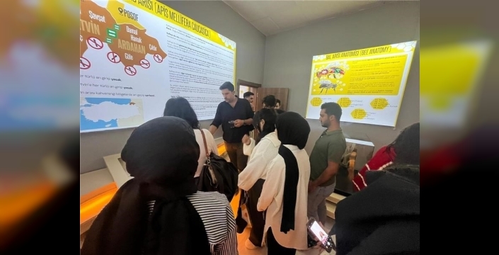 Laboratuvarlarda yapılan incelemelerde, arı ırklarının korunması, verim analizi ve kalite standartlarına ilişkin uygulamalı bilgiler paylaşıldı. Etkinliğin ikinci bölümünde, Yönetim ve Organizasyon Bölümü öğretim elemanı Öğr. Gör. Burçak Yakın tarafından yürütülen girişimcilik dersi kapsamında Arıcılık Müzesi ziyaret edilerek Kafkas Arısı’nın özellikleri, bölgede arılar için önemli bal bitkileri, ekolojik çeşitlilik ve yerel flora hakkında bilgilendirme yapıldı. Bu çerçevede, arı ürünlerinin yalnızca bir üretim faaliyeti değil, aynı zamanda katma değeri yüksek bir girişimcilik alanı olduğu vurgulandı. Öğrenciler daha sonra üretim merkezinde, ileri dönüşüm petek üretimi, propolis ve polen toplama cihazları gibi yenilikçi uygulamaları yerinde gözlemledi. Ayrıca, arı ürünlerinin işlenmesine yönelik cihazlar ile üretim hattında kullanılan teknolojiler tanıtıldı. Etkinlik, öğrencilerin merkezde üretilen doğal Kafkas balının tadımını yapmalarıyla son buldu. Böylece öğrenciler, üretimden tüketime uzanan süreci doğrudan deneyimleme fırsatı buldu. Gerçekleştirilen teknik gezi ile öğrenciler, zootekni bilimi, sürdürülebilir üretim, yerel kalkınma ve girişimcilik arasında bütüncül bir bakış açısı geliştirdiler.