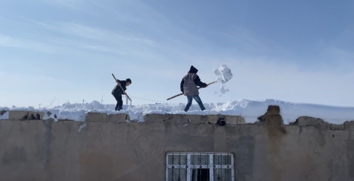 Yoğun kar yükü nedeniyle risk oluşturan evlerin çatıları temizlenirken, hayvan ahırlarına ulaşımı sağlayan yollar da imece usulüyle yeniden açıldı.