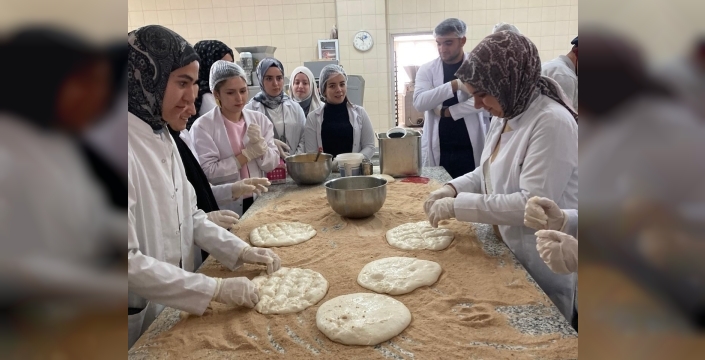 Gerçekleştirilen uygulamalı eğitimde öğrenciler, Ramazan pidesi üretim sürecini yerinde gözlemleyerek üretim aşamaları hakkında bilgi aldı ve üretim çalışmalarına destek verdi.
