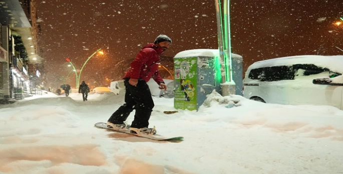 Kent merkezinde iki arkadaş, karlı yolları fırsat bilerek snowboard yaptı. Kaygan zemini avantaja çeviren Fırat Taşbulak ve Bülent Öğüt, kendilerine ait snowboard ile sokaklarda kayarak karın keyiflini çıkardı. O anlar çevredeki vatandaşların ilgisini çekerken, bazıları ise cep telefonlarıyla bu anları kaydetti.