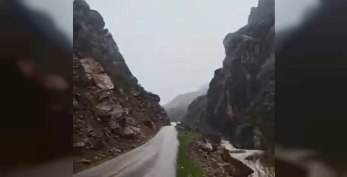 Hakkari’nin Şemdinli ilçesinde etkili olan sağanak yağışlar sonrası yamaçtan kopan dev kaya kütlesi yolu ulaşıma kapattı.