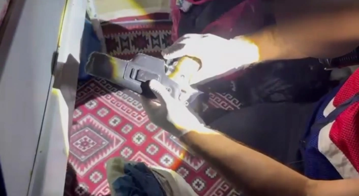 Yapılan aramada, 3.9 mm çapında ruhsatsız tabanca, 6 tabanca şarjörü 1 kurusıkı tabanca, 95 tabanca mühimmatı, 46 adet kurusıkı tabanca mühimmatı ele geçirilerek muhafaza altına alındı.