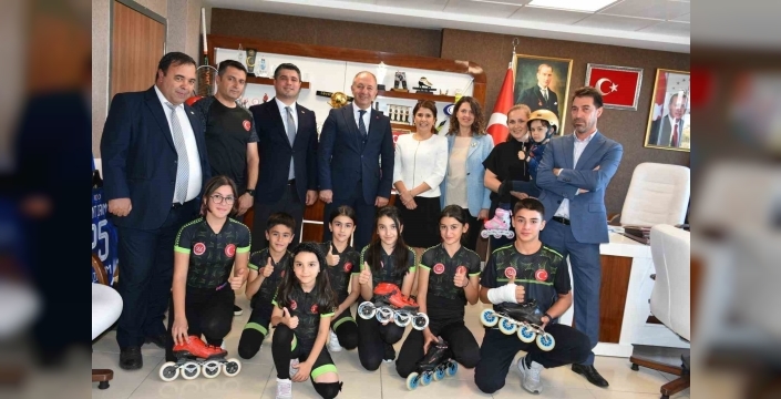 Kulüp Başkanı Buket Aydın, ziyaret anısına İl Müdürü Levent Çakmur’a Speed Skating Spor Kulübünün formasını hediye ederek takımın maçlarına davet etti.