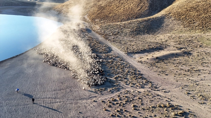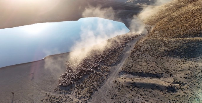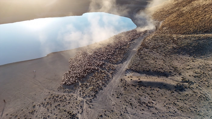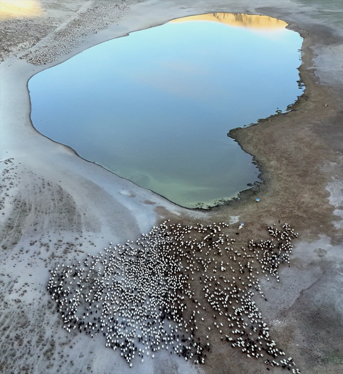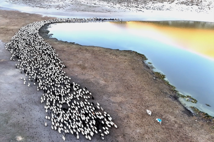 Gölde su için binlerce koyun, dron ile görüntülendi.