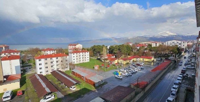 Bitlis’in Tatvan ilçesinde etkili olan yağışların ardından ortaya çıkan gökkuşağı, Van Gölü ve şehir merkezi üzerinde güzel görüntüler oluşturdu.