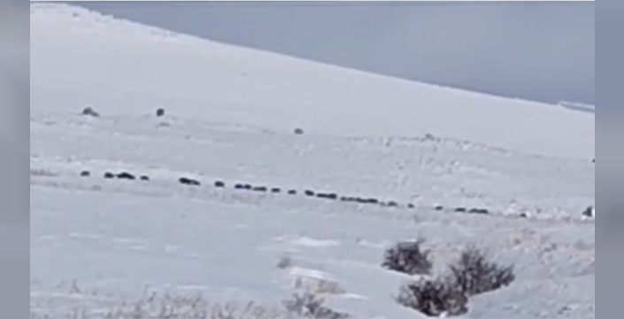 SERHED HABER- Bölgede seyir halinde olan köylüler tarafından kayda alınan görüntülerde, onlarca domuzun tek hiza halinde karla kaplı arazide ilerleyerek dağ yamaçlarına doğru kaçtığı görülüyor.