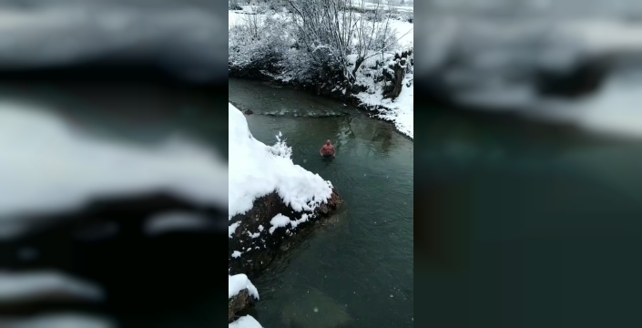 Nesli tükenme tehlikesiyle karşı karşıya bulunan su samurları, çayın bir bölümünde yüzerken, aynı çayın başka bir noktasında ise yöredeki gençler soğuk ve kara aldırış etmeden suya girdi.