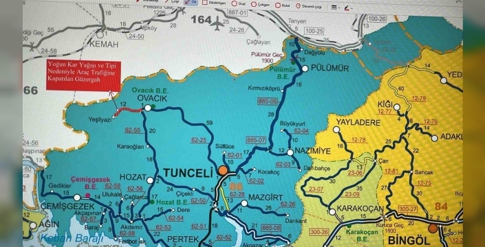 Ayrıca, 62-03 KK No’lu Nazımiye-Dallıbahçe İl Yolunun 12-21 kilometreleri arası ile 62-04 KK No’lu Ayrım-Dereova İl Yolunun 0-10 kilometreleri arası, yoğun kar yağışı sebebiyle saat 15.35 itibarıyla ulaşıma kapatıldı. Bununla birlikte, 62-25 KK No’lu Tunceli-Ovacık-Yeşilyazı İl Yolunun 62-73 kilometreleri arası da yoğun kar yağışı ve tipi nedeniyle görüş mesafesinin kısıtlanması sonucu saat 16.30 itibarıyla araç trafiğine kapatıldı.