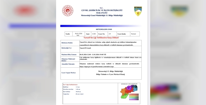 Meteoroloji 13. Bölge Müdürlüğü’nden yapılan açıklamada, " Tunceli’de yüksek kar örtüsüne sahip eğimli alanlarda çığ tehlikesi bulunduğundan yaşanabilecek olumsuzluklara karşı dikkatli ve tedbirli olunması gerekmektedir. Çığ tehlikesine karşı ilgililerin ve vatandaşlarımızın dikkatli ve tedbirli olması önem arz etmektedir" denildi.