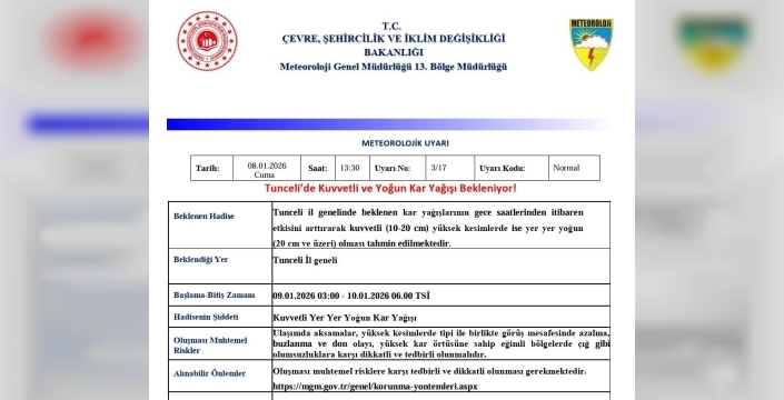 SERHED HABER - Meteoroloji 13. Bölge Müdürlüğü’nden yapılan uyarıda, "Tunceli il genelinde beklenen kar yağışlarının sabah saatlerinden itibaren etkisini arttırarak kuvvetli (10-20 cm) yüksek kesimlerde ise yer yer yoğun (20 cm ve üzeri) olması tahmin edilmektedir.