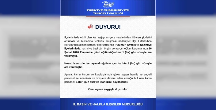 Valilikten yapılan açıklamada, "İlçelerimizde etkili olan kar yağışının gece saatlerinden itibaren şiddetini artırması ve buzlanma tehlikesi oluşması nedeniyle; İlçe Hıfzıssıhha Kurullarınca alınan kararlar doğrultusunda Pülümür, Ovacık ve Nazımiye ilçelerimizde, resmi ve özel tüm örgün ve yaygın eğitim kurumlarında 26 Şubat 2026 Perşembe günü eğitim-öğretime 1 (bir) gün süreyle ara verilmiştir. Hozat ilçemizde ise taşımalı eğitime aynı tarihte 1 (bir) gün süreyle ara verilmiştir. Ayrıca; kamu kurum ve kuruluşlarında görev yapan hamile ve engelli personel ile anaokulu ve kreşlere devam eden çocuğu bulunan kadın personel, 1 (bir) gün süreyle idari izinli sayılacaktır" ifadelerine yer verildi.