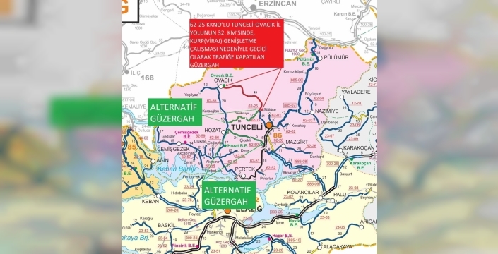 Tunceli-Ovacık il yolunun 32’nci kilometresinde yürütülecek genişletme çalışmaları kapsamında kontrollü patlatma yapılacağı bildirildi. Bu kapsamda, 21 Nisan 2026 tarihinde saat 08.00 itibarıyla Karşılar Karakolu ile Ovacık ilçe merkezi arasındaki 15-60 kilometrelik güzergâhın trafiğe kapatılacağı duyuruldu.