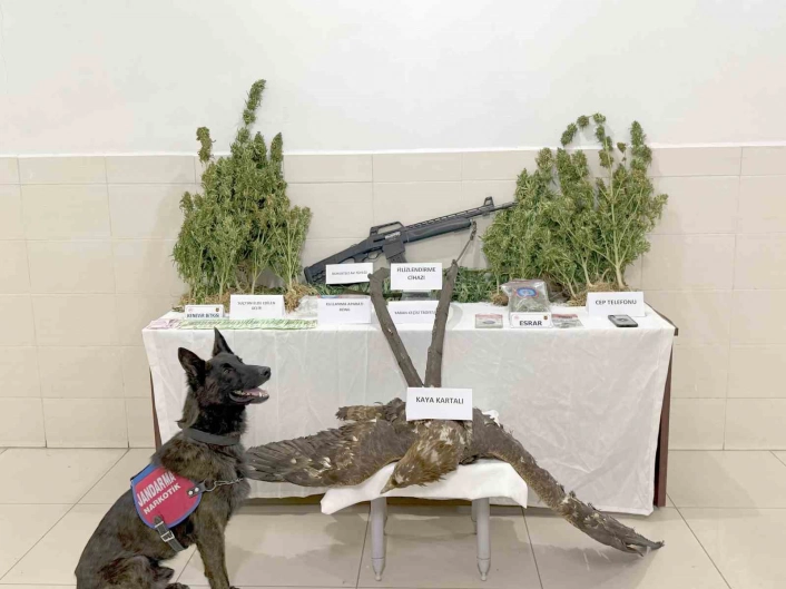 Şahsın evinde ve eklentilerinde yapılan aramalarda 50 kök kenevir bitkisi, 176 gram kubar esrar, 5 bin 900 Euro para, uyuşturucu üretiminde kullanılan filizlendirme ve iklimlendirme aparatı, ruhsatsız av tüfeği, cep telefonu, kaçak avlanan kaya kartalı trofesi, kaçak avlanan dağ keçisi boynuzu, 300 metre sulama hortumu ve "bong" olarak bilinen uyuşturucu kullanım aparatı ele geçirilmişti.