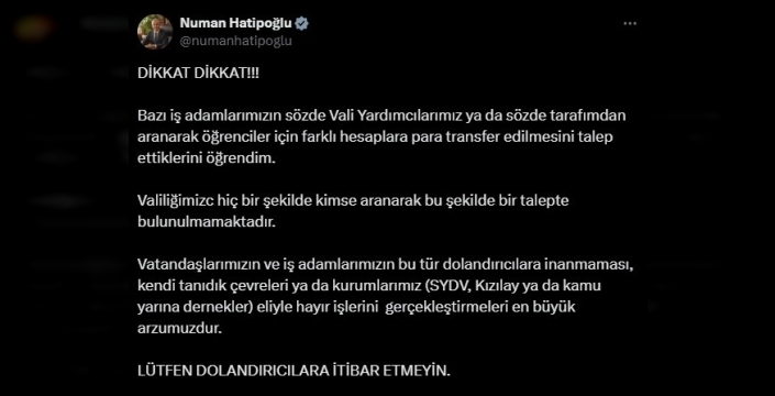 SERHED HABER- Vali Hatipoğlu sosyal medya hesabından yaptığı açıklamada, "Bazı iş adamlarımızın sözde vali yardımcılarımız ya da sözde tarafımdan aranarak öğrenciler için farklı hesaplara para transfer edilmesini talep ettiklerini öğrendim.