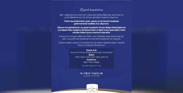 "Kıymetli hemşehrilerim, Iğdır Valiliği görevine atanmam dolayısıyla gösterdiğiniz ilgi, samimiyet ve güzel dilekleriniz için her birinize gönülden teşekkür ediyorum. Tebrik ziyaretlerinizde çiçek, çelenk ya da benzeri hediyeler getirmemenizi özellikle rica ediyorum. Dileyen hemşehrilerimin, bu güzel niyetlerini Orman Bölge Müdürlüğümüz aracılığıyla fidan bağışına dönüştürmeleri ve Iğdır’ımızın geleceğine nefes olmaları bizleri ayrıca memnun edecektir. İnanıyorum ki bugün dikilen her fidan; yarın Yeşil Iğdır adına atılmış kalıcı bir adım, çocuklarımıza bırakılacak en kıymetli miraslardan biri olacaktır. Göstereceğiniz anlayış ve hassasiyet için şimdiden teşekkür ediyor, hepinizi sevgi ve saygıyla selamlıyorum.