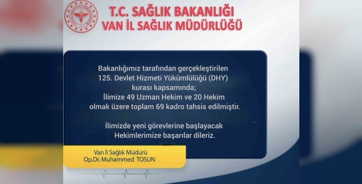 Van İl Sağlık Müdürlüğünden yapılan açıklamada, yeni atanan hekimlerin kentin farklı ilçelerinde göreve başlayacağı belirtilerek, "İlimizde yeni görevlerine başlayacak hekimlerimize başarılar dileriz" denildi.