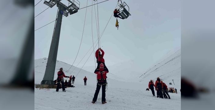SERHED HABER- Senaryo gereği kayak merkezinde meydana gelen çığ nedeniyle elektrik kesintisi yaşanırken, telesiyejde 4 kişi mahsur kaldı. Olay yerine sevk edilen ekipler, telesiyejde mahsur kalanları güvenli şekilde tahliye ederek aşağı indirdi.