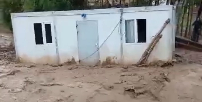 Aniden bastıran sağanak sonrası oluşan sel, 2020'de meydana gelen depremin ardından mahalleye kurulan boş konteynerleri sürükledi.