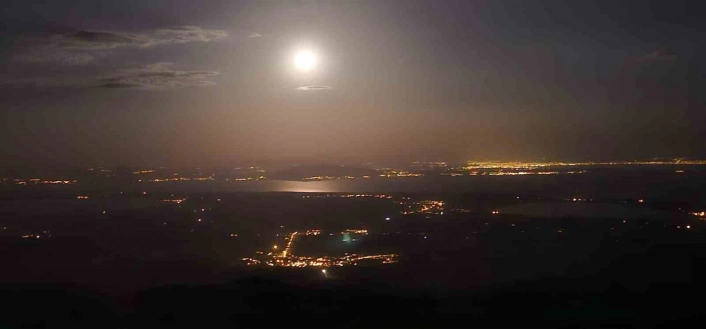 SERHED HABER - Bitlis sınırları içinde yer alan Türkiye'nin üçüncü en yüksek dağı olan Süphan Dağı, bu kez doğa tutkunlarına unutulmaz bir gece yaşattı. Gecenin ilerleyen saatlerinde gökyüzünde beliren dolunay, Van Gölü'ne yansıyan görüntüsüyle görenleri mest etti. Fotoğraf tutkunları, kampçılar ve doğaseverler Süphan Dağının eteklerinde bir araya gelerek bu eşsiz manzarayı izledi. Sessizliğin ve doğanın büyüleyici atmosferi içinde yükselen dolunay, gökyüzündeki yolculuğuna Van Gölü'ne yansıyarak devam etti. Göl yüzeyindeki altın sarısı yansımalar, manzarayı adeta bir tabloya dönüştürdü.