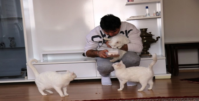 Kale Yolu üzerindeki kedi evinin yaklaşık 4 ay önce kapandığını belirten Binici, “Oranın yetkilileri bu işi devralmak istediler. ‘İşi, ehline bırakın’ diye bir söz var. Maalesef onlar yürütemediler ve sonuç alamadılar. Sonuç alamayınca orada bir sıkıntı oluştu ve şuan ziyaretçiye kapalı. Ama orada hala Van kedileri var. Bende orada şahsıma ait olan 18 Van kedisini de evime getirdim. Bunlar dişi ve hamile olan kedilerdi. Orada kalmalarına müsaade edemezdim. Çünkü doğum esnasında doğacak olan yavrulara titizlikle bakmak gerekiyor. Büyük bir tecrübe istiyordu. Eve getirdiğim kedilerden yaklaşık 42 yavru elde ettim. Bu yavrular büyüdü ve 3 aylık oldu. Yavrular, çok güzel ailelere verildi. Çok güzel takip ediyorum ve hepsinin durumu çok iyi. Bu da o yavrulardan biri. Adı Kont. Kont sağır bir kedi olduğu için ona özel bir ilgi alaka gerektiriyor. Normal bir aileye veremezdim. Ömür boyu bende kalacak. Kısırlaştıracağım. İlerde eşleşmesine izin veremem. Çünkü yavrularının da sağır olmasını istemem” ifadelerini kullandı.