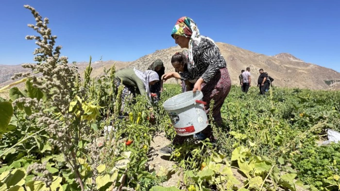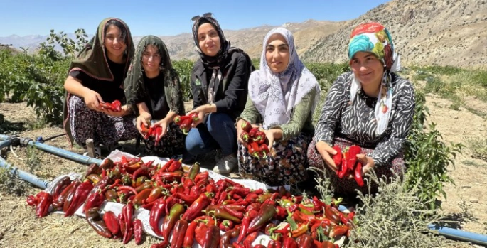 SERHEDHABER - Yüksekova'da yağışlar, tarım ürünlerinde verimin artmasına neden oldu. Bereketli bir mevsim yaşayan çiftçiler, ektikleri ürünlerin hasadına başladı. İlçeye 40 kilometre uzaklıktaki Gökyurt köyüne bağlı Yeşildere Mezrası’nda yaşayan çiftçi kadınlar, ektikleri biberin hasadı için yoğun mesai harcıyor. Sabahın ilk ışıklarıyla birlikte tarlaya giden kadınlar, kapya biberin hasadını gerçekleştiriyor.